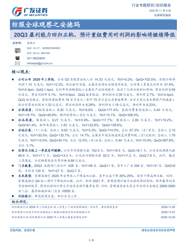 【广发证券】【20201108】纺服全球观察之安德玛:20Q3盈利能力回归正轨,预计重组费用对利润的影响将继续降低-5页 行业研究