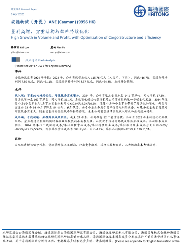 【海通国际】【20250406】安能物流(开曼)量利高增,货重结构与效率持续优化-10页 公司研究