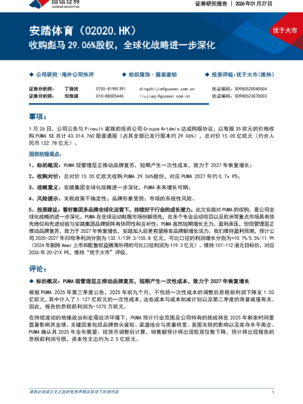 【国信证券】【202601】安踏体育(02020.HK)收购彪马 29.06%股权,全球化战略进一步深化-6页 证券期货研究报告
