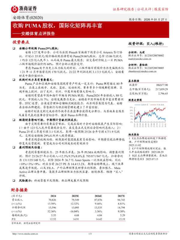 【浙商证券】【202601】收购 PUMA股权,国际化矩阵再丰富——安踏体育点评报告-3页 证券期货研究报告