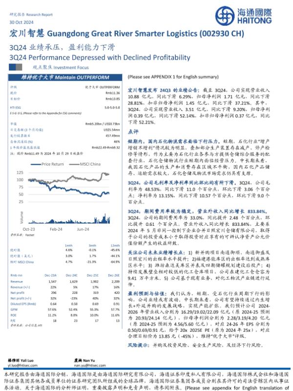 【海通国际】【20241030】宏川智慧(002930)3Q24业绩承压,盈利能力下滑-13页 行业研究