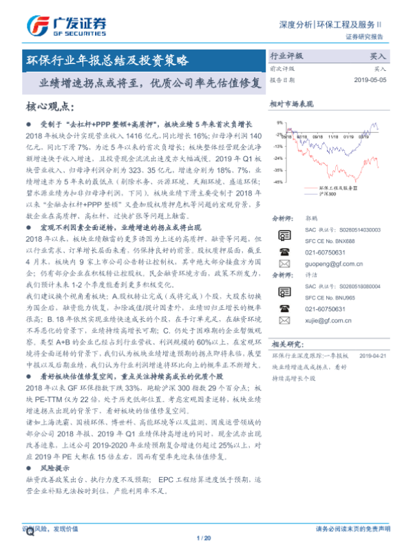 【广发证券】【20190505】环保行业年报总结及投资策略:业绩增速拐点或将至,优质公司率先估值修复-20页 行业研究