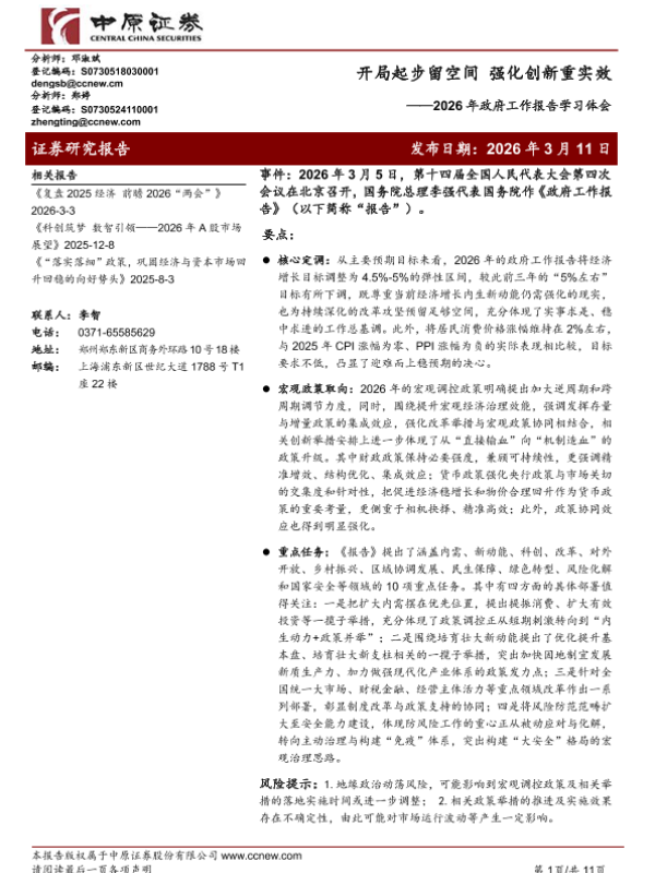 【中原证券】【202603】2026年政府工作报告学习体会:开局起步留空间强化创新重实效-11页 证券期货研究报告