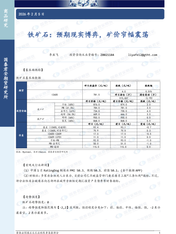 【国泰君安期货】【202602】铁矿石:预期现实博弈,矿价窄幅震荡-2页 证券期货研究报告