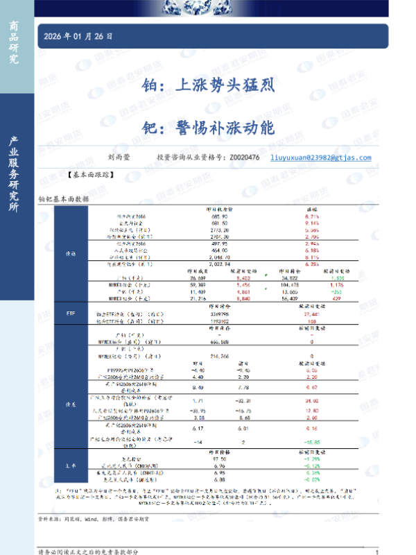 【国泰君安期货】【202601】铂:上涨势头猛烈,钯:警惕补涨动能-3页 证券期货研究报告