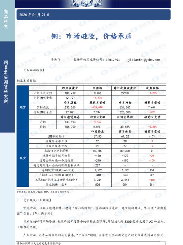 【国泰君安期货】【202601】铜:市场避险,价格承压-3页 证券期货研究报告