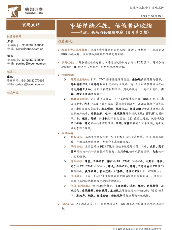 【德邦证券】【20230813】情绪、轮动与估值周观察(8月第2期):市场情绪不振,估值普遍收缩-21页 行业研究