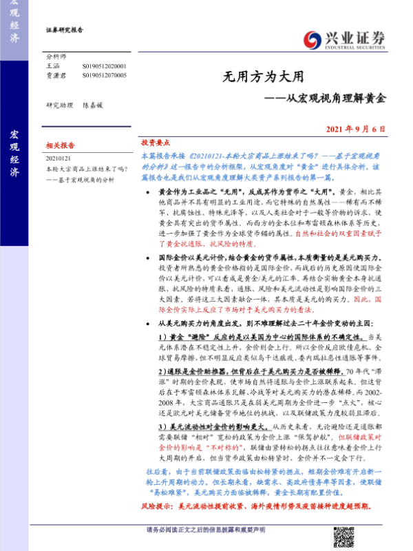 【兴业证券】【20210906】从宏观视角理解黄金:无用方为大用-15页 行业研究