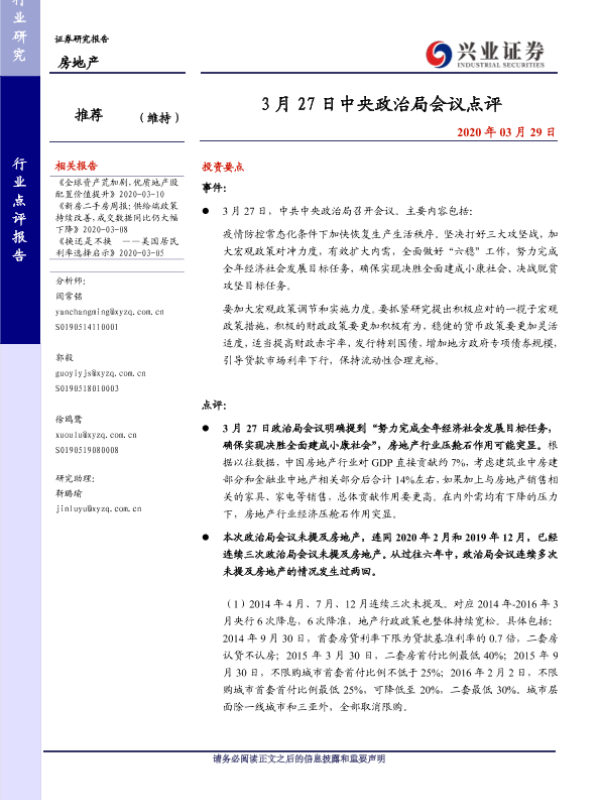 【兴业证券】【20200329】3月27日中央政治局会议点评-3页 行业研究
