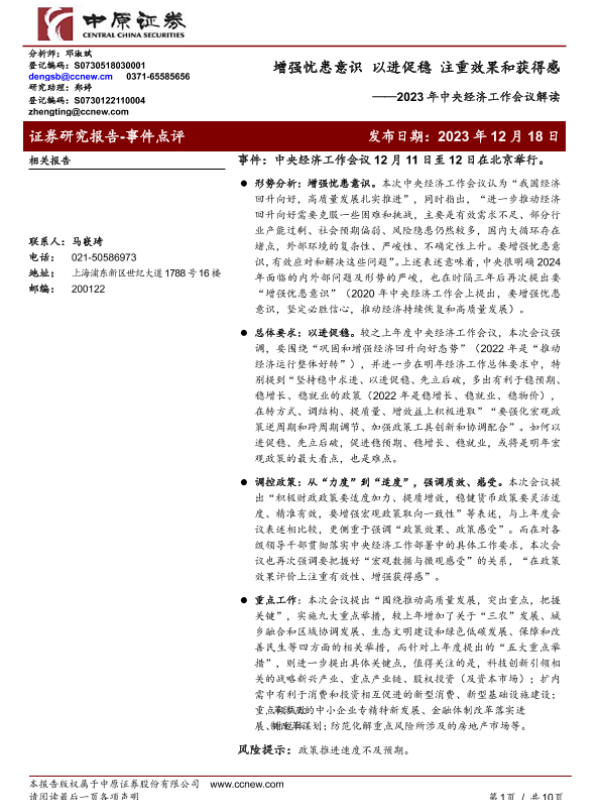 【中原证券】【20231218】2023年中央经济工作会议解读:增强忧患意识 以进促稳 注重效果和获得感-10页 宏观策略