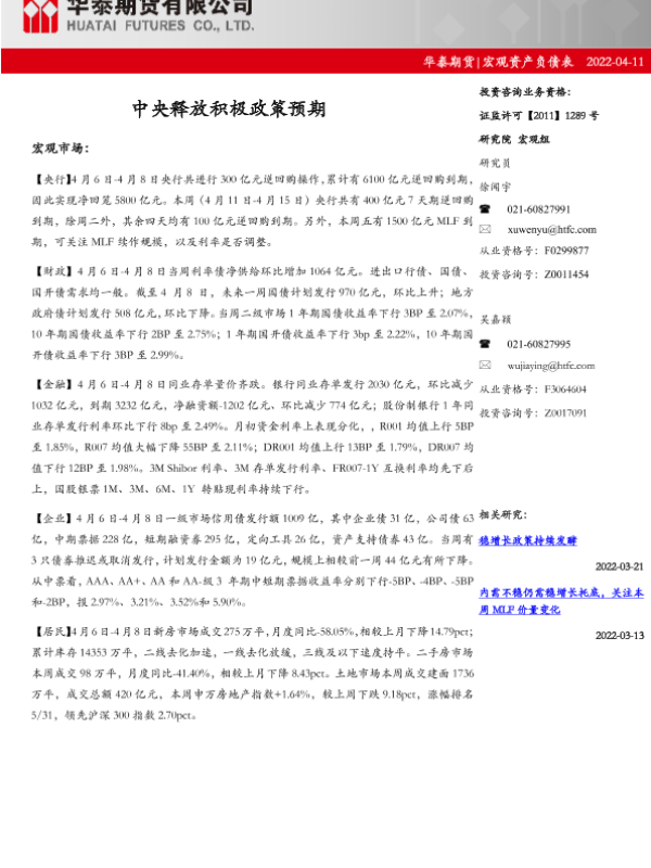 【华泰期货】【20220411】宏观资产负债表:中央释放积极政策预期-15页 行业研究