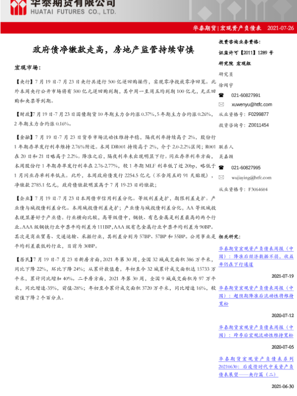【华泰期货】【20210726】宏观资产负债表:政府债净缴款走高,房地产监管持续审慎-17页 行业研究