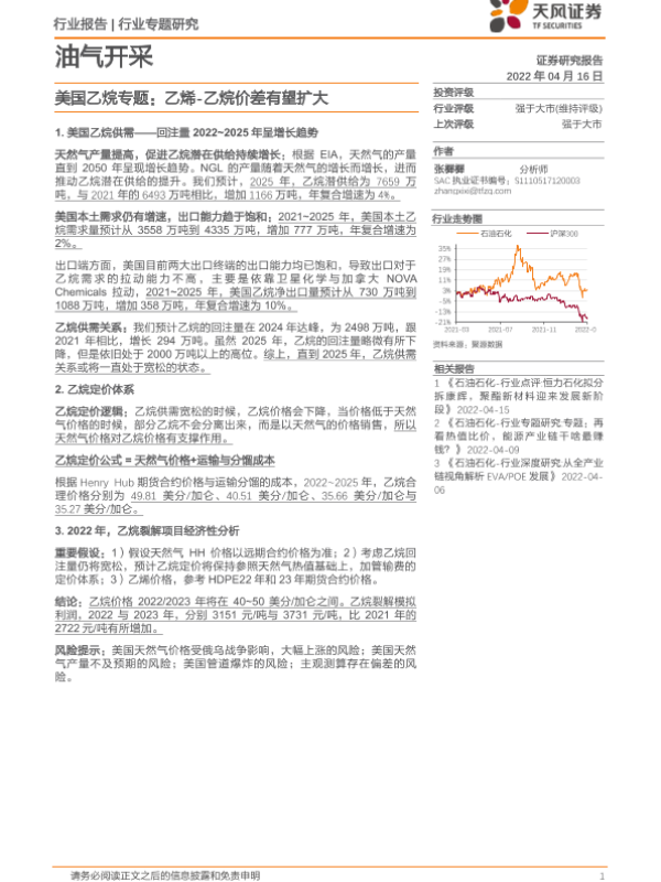 【天风证券】【20220416】油气开采美国乙烷专题:乙烯-乙烷价差有望扩大-9页 行业研究