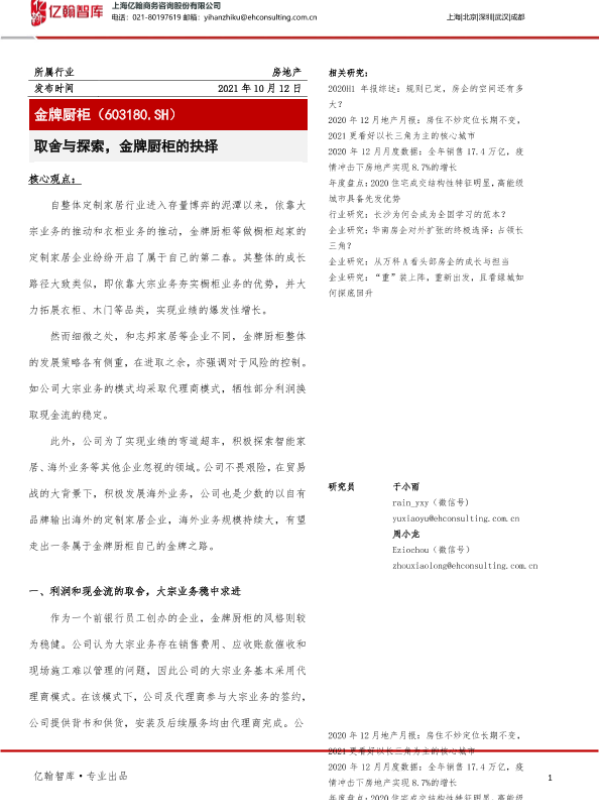 【亿翰智库】【20211012】取舍与探索,金牌厨柜的抉择-14页 公司研究