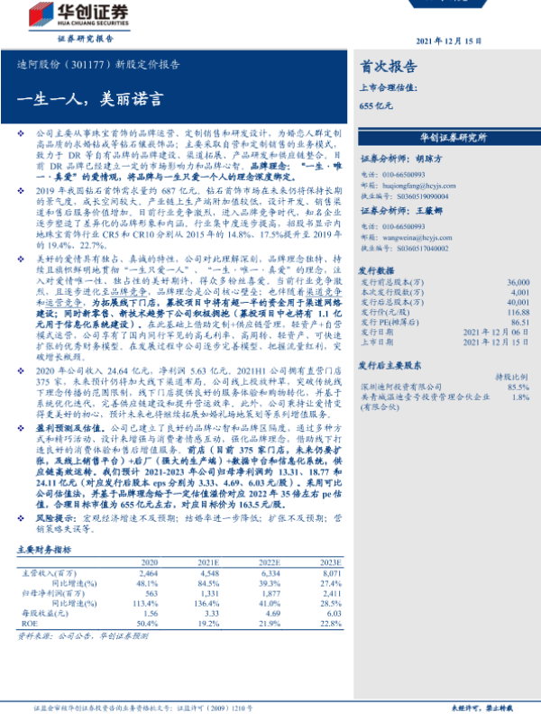 【华创证券】【20211215】迪阿股份(301177)新股定价报告:一生一人,美丽诺言-25页 行业研究