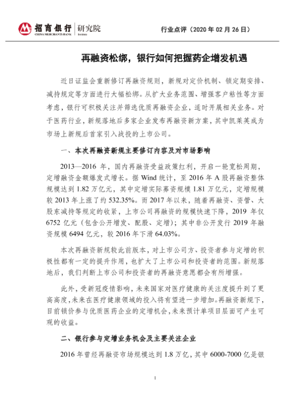 【招商银行】【20200226】银行行业点评:再融资松绑,银行如何把握药企增发机遇-3页 行业研究