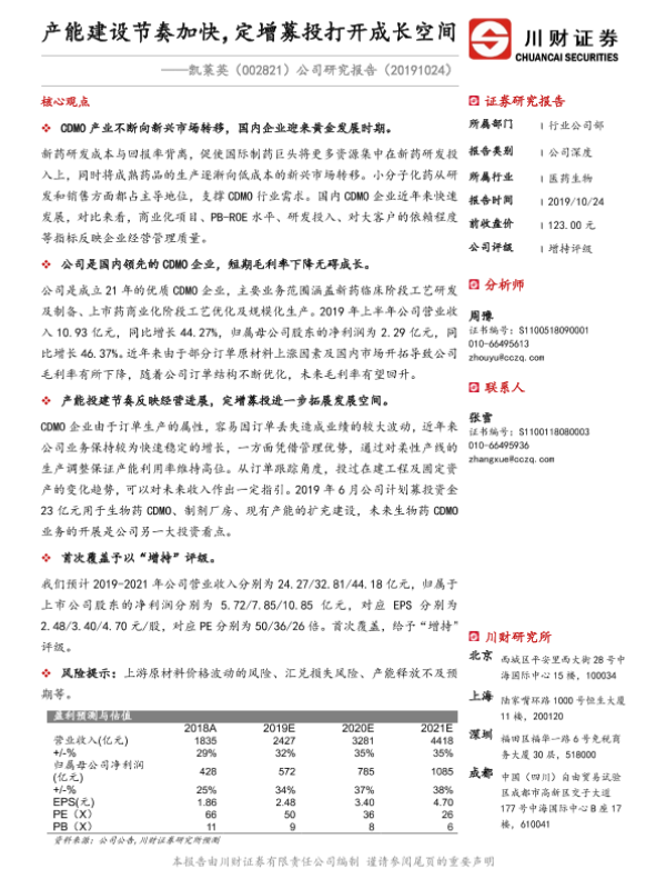 【川财证券】【20191024】凯莱英-002821.SZ-公司研究报告:产能建设节奏加快,定增募投打开成长空间-38页 行业研究