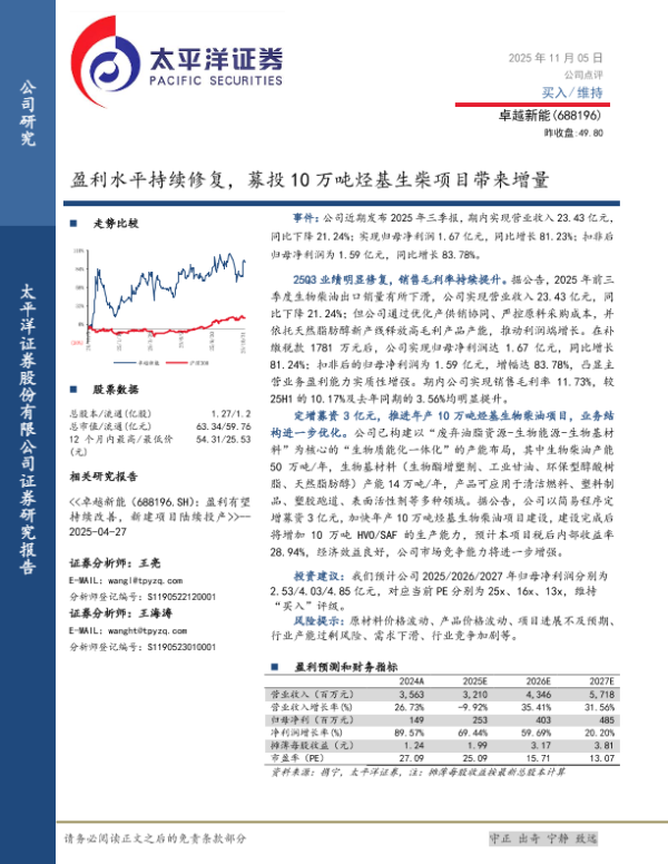 【太平洋证券】【202511】盈利水平持续修复,募投10万吨烃基生柴项目带来增量-4页 证券期货研究报告
