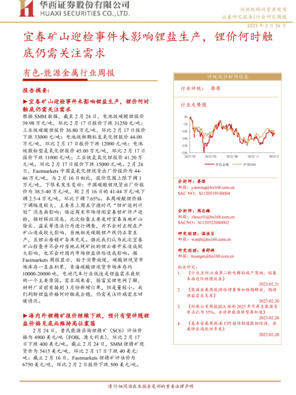 【华西证券】【20230226】有色-能源金属行业周报:宜春矿山迎检事件未影响锂盐生产,锂价何时触底仍需关注需求-37页 行业研究