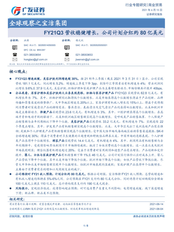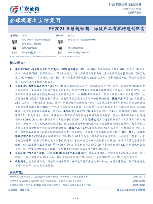 【广发证券】【20210810】商业贸易行业全球观察之宝洁集团:FY2021业绩超预期,保健产品有机增速创新高-5页 行业研究