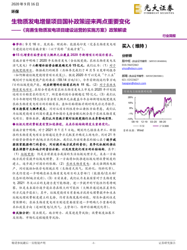 【光大证券】【20200916】完善生物质发电项目建设运营的实施方案政策解读:生物质发电增量项目国补政策迎来两点重要变化-2页 行业研究