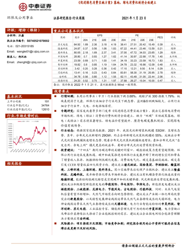 【中泰证券】【20220123】环保及公用事业行业周报:《促进绿色消费实施方案》落地,绿电消费机制将全面建立-22页 行业研究