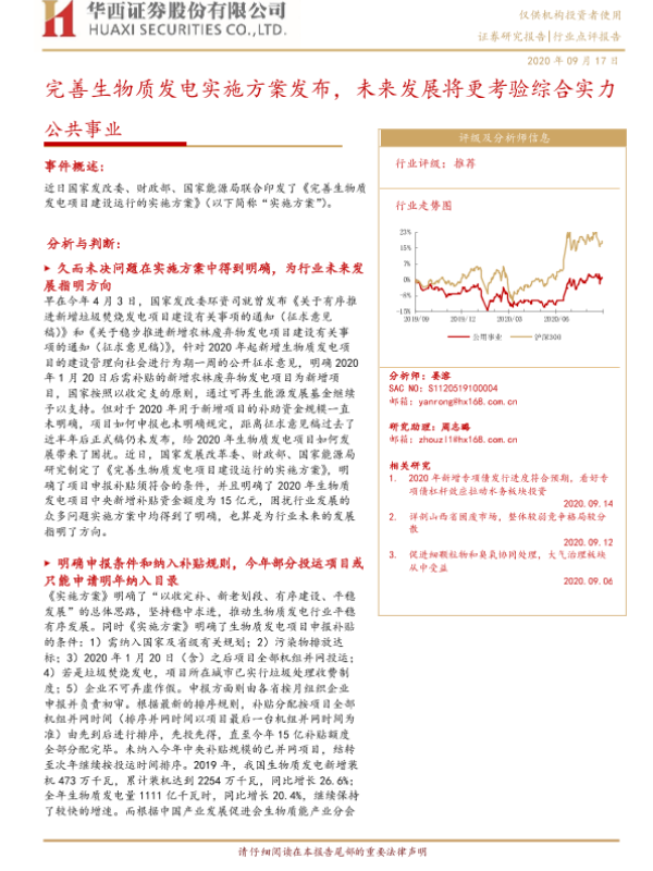 【华西证券】【20200917】完善生物质发电实施方案发布,未来发展将更考验综合实力-5页 行业研究