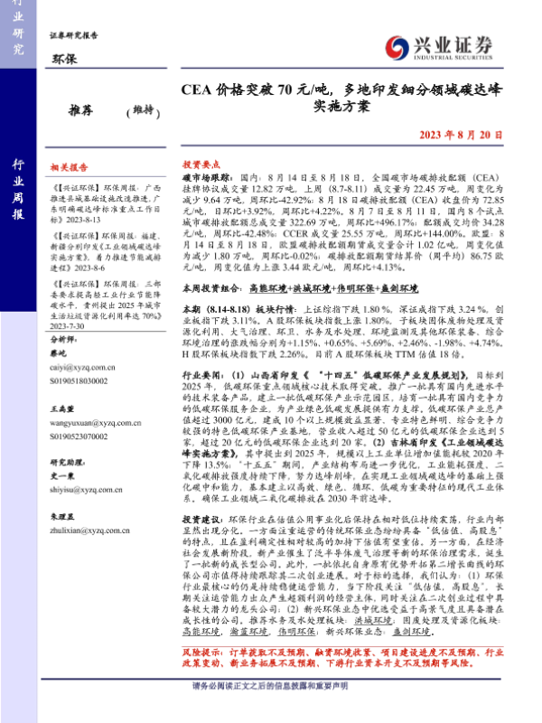 【兴业证券】【20230820】CEA价格突破70元/吨,多地印发细分领域碳达峰实施方案-11页 行业研究