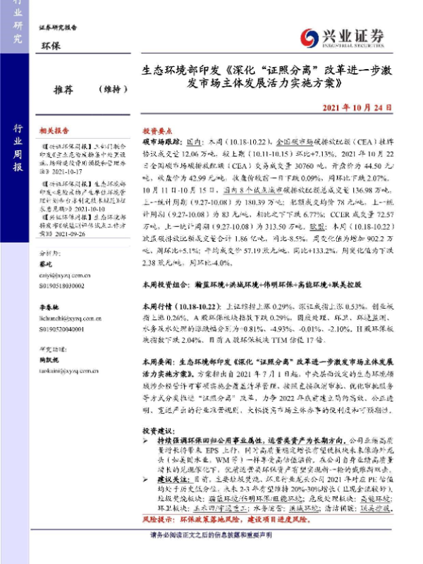 【兴业证券】【20211024】环保行业周报:生态环境部印发《深化“证照分离”改革进一步激发市场主体发展活力实施方案》-11页 行业研究