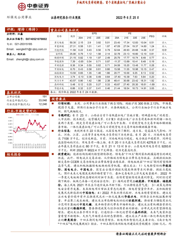 【中泰证券】【20220625】多地用电负荷创新高,首个省级虚拟电厂实施方案出台-19页 行业研究