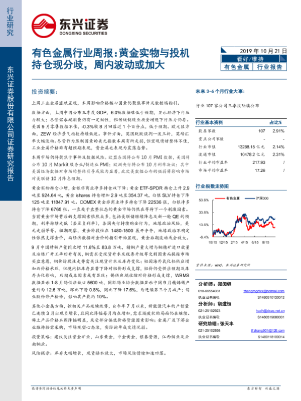 【东兴证券】【20191021】20191021-东兴证券-有色金属行业周报:黄金实物与投机持仓现分歧,周内波动或加大-16页 行业研究