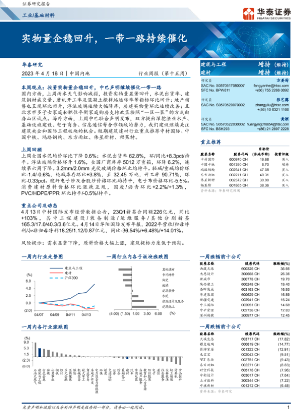 【华泰证券】【20230416】工业基础材料行业周报:实物量企稳回升,一带一路持续催化-22页 行业研究