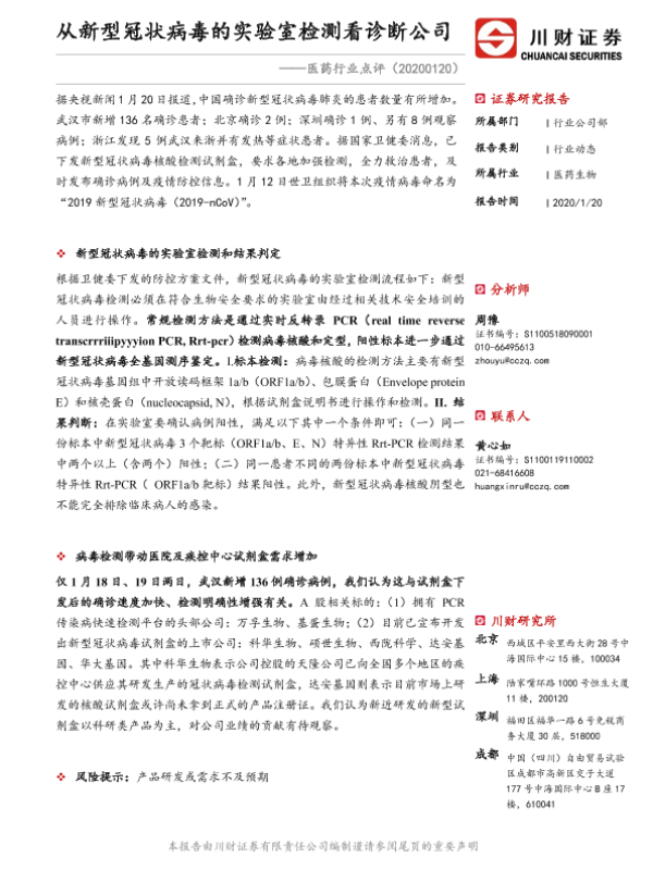 【川财证券】【20200120】从新型冠状病毒的实验室检测看诊断公司-2页 证券期货研究报告