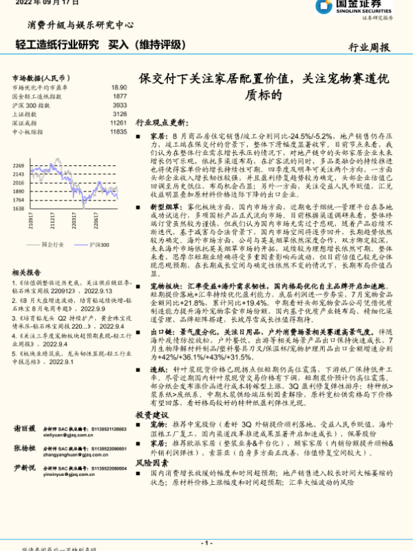 【国金证券】【20220917】20220917-国金证券-轻工造纸行业研究:保交付下关注家居配置价值,关注宠物赛道优质标的-17页 行业研究