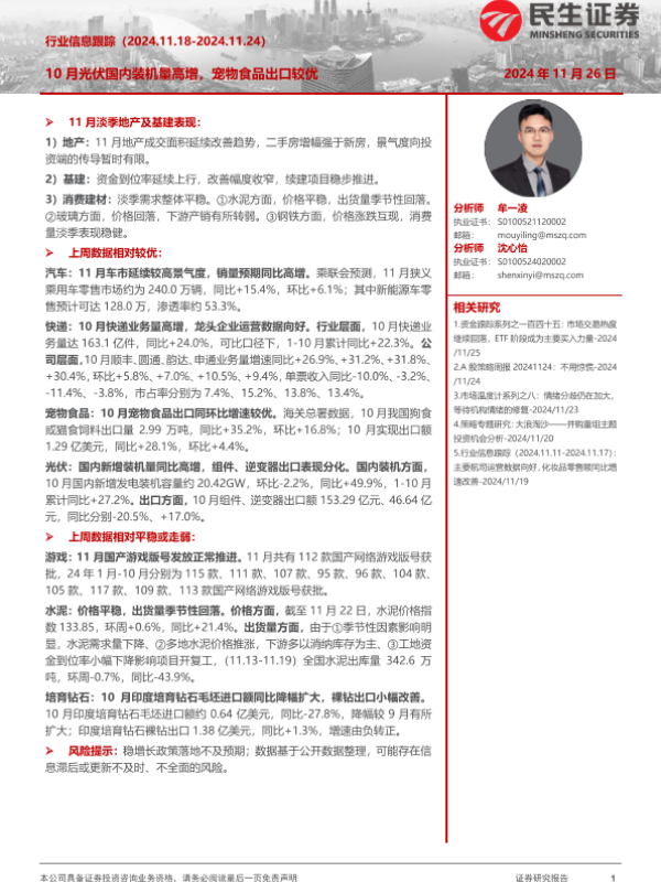 【民生证券】【20241126】行业信息跟踪:10月光伏国内装机量高增,宠物食品出口较优-25页 行业研究