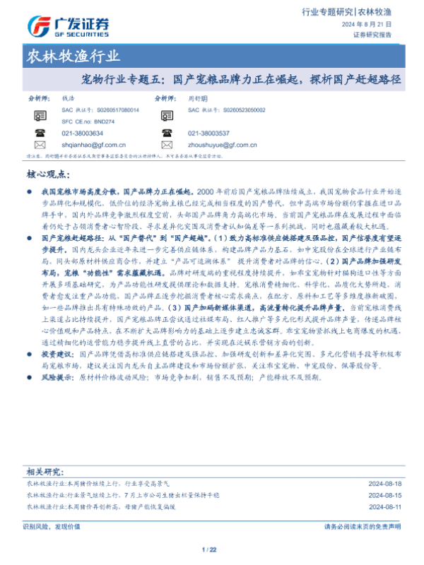 【广发证券】【20240821】2024年08月22日更新-农林牧渔行业:宠物行业专题五国产宠粮品牌力正在崛起探析国产赶超路径-22页 行业研究