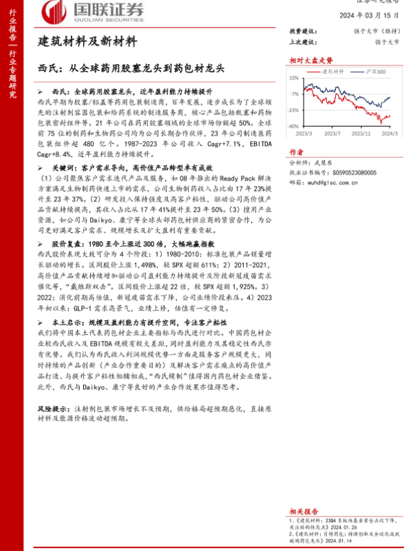 【国联证券】【20240315】建筑材料及新材料:西氏:从全球药用胶塞龙头到药包材龙头-15页 行业研究