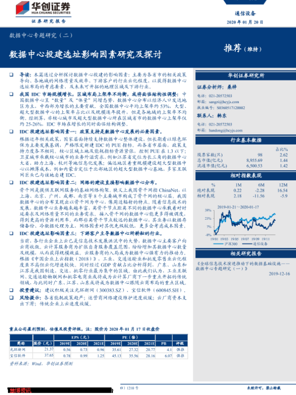 【华创证券】【20200120】通信设备数据中心专题研究(二):数据中心投建选址影响因素研究及探讨-30页 行业研究