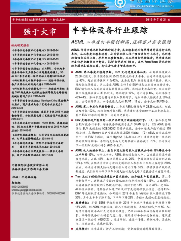 【中银证券】【20190721】半导体设备行业跟踪:ASML二季度订单额创新高,逻辑客户需求强劲-6页 行业研究