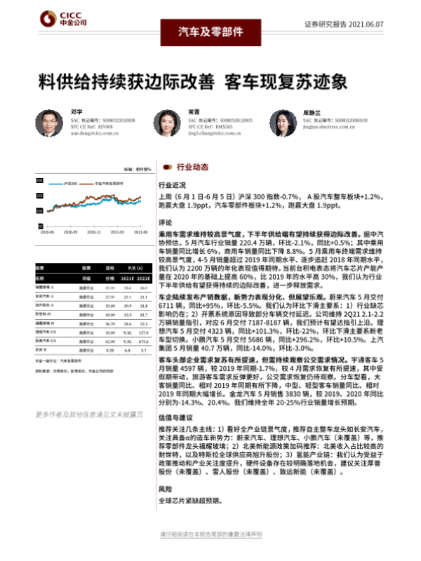 【中金公司】【20210607】汽车及零部件:料供给持续获边际改善 客车现复苏迹象-16页 行业研究