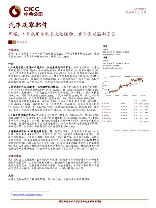 【中金公司】【20210510】汽车及零部件行业周报:4月乘用车需求比较强劲,客车需求温和复苏-13页 行业研究