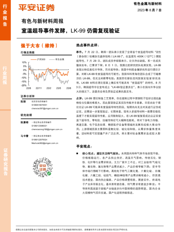 【平安证券】【20230807】20230807-平安证券-有色与新材料周报:室温超导事件发酵,LK-99仍需复现验证-16页 行业研究