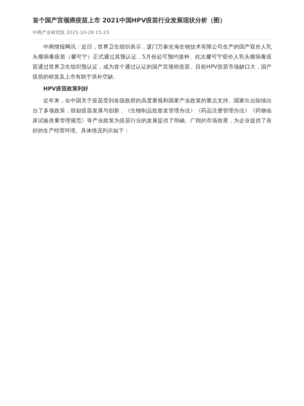 【中商产业研究院】【20211028】首个国产宫颈癌疫苗上市 2021中国HPV疫苗行业发展现状分析-4页 行业研究