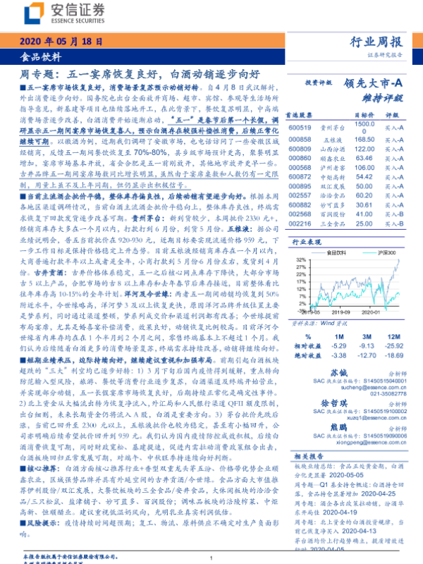 【安信证券】【20200518】食品饮料周专题:五一宴席恢复良好,白酒动销逐步向好-23页 行业研究