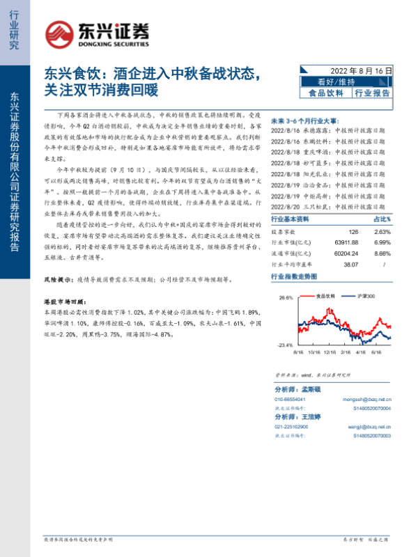 【东兴证券】【20220816】东兴食饮:酒企进入中秋备战状态,关注双节消费回暖-7页 行业研究