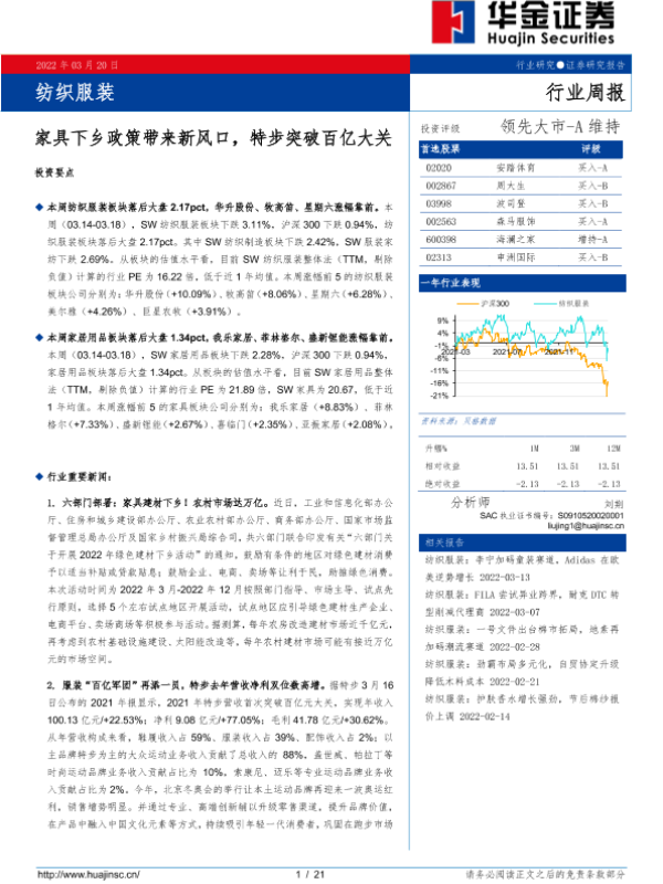 【华金证券】【20220320】20220320-华金证券-纺织服装行业周报:家具下乡政策带来新风口,特步突破百亿大关-21页 行业研究