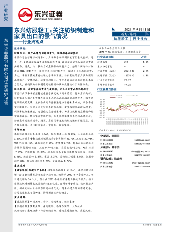 【东兴证券】【20210913】东兴纺服轻工行业周观点:关注纺织制造和家具出口的景气情况-10页 行业研究