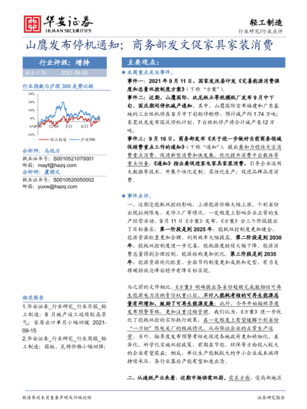 【华安证券】【20210920】轻工制造:山鹰发布停机通知;商务部发文促家具家装消费-3页 行业研究
