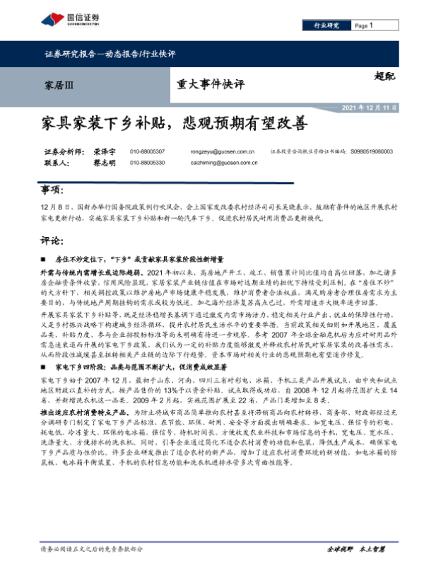 【国信证券】【20211211】家居Ⅲ:家具家装下乡补贴,悲观预期有望改善-4页 行业研究