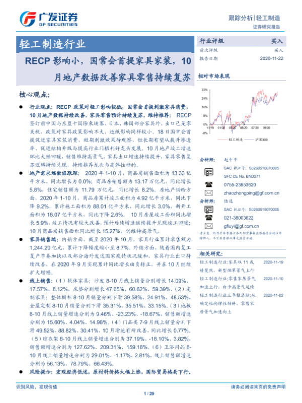 【广发证券】【20201122】轻工制造行业:RECP影响小,国常会首提家具家装,10月地产数据改善家具零售持续复苏-29页 行业研究